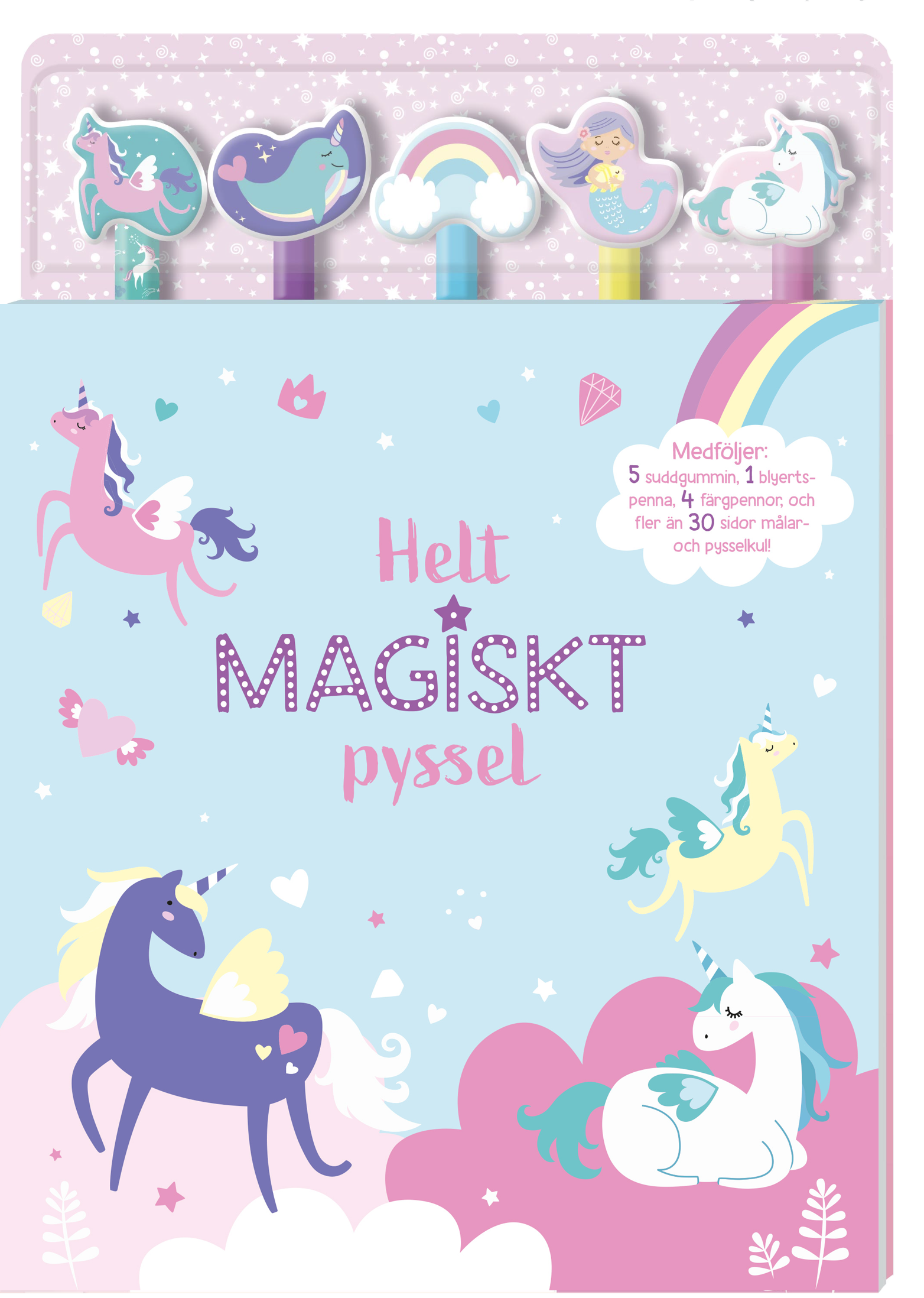 I den här boken får du träffa fantastiska enhörningar, förtrollande sjöjungfrur och alla deras magiska vänner. Färglägg de underbara bilderna och klura ut de roliga pysslen med hjälp av medföljande pennor och suddgummin. Låt fantasin flöda och kliv in i en helt magisk pysselvärld!