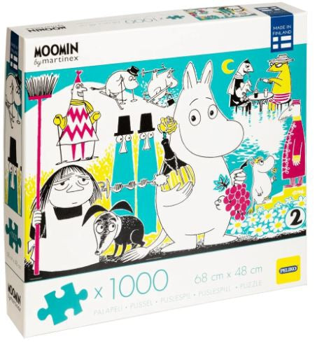 Färgrikt Muminpussel med illustration från serien. 1000 bitars pussel av återvunnen kartong. Det färdiga pusslet är 68x48 cm.
