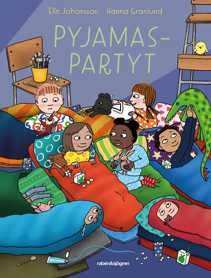 Det är kväll och nästan mörkt ute när vi är på väg till skolan. Visst ska det bli kul med pyjamasparty? viskar jag i Frassens öra. Frassen är min gosedjurshund och han ska vara med när klassen sover över i skolan i natt. Det känns kul och lite nervöst, för det är första gången som jag ska sova någonstans utan pappa. När vi kommer fram packar alla upp liggunderlagen och sovsäckarna. Det är jättemysigt. Fröken börjar poppa popcorn och vi säger hejdå till våra föräldrar. Men, det är så konstigt, för de verkar nästan inte vilja gå …
